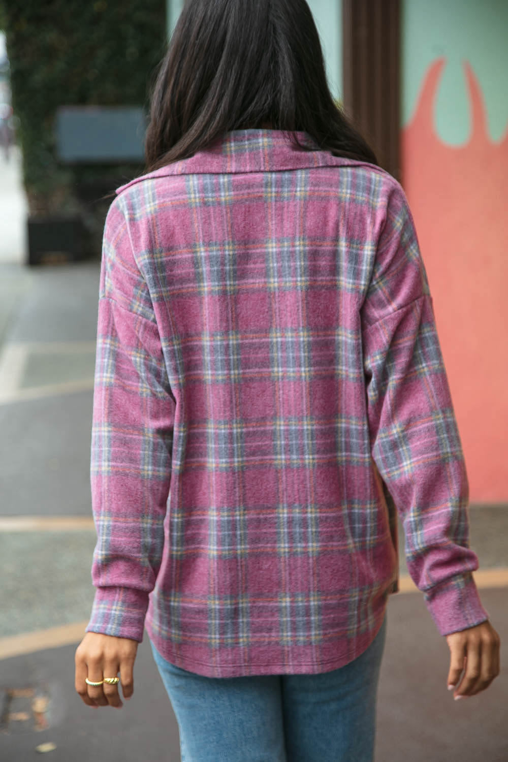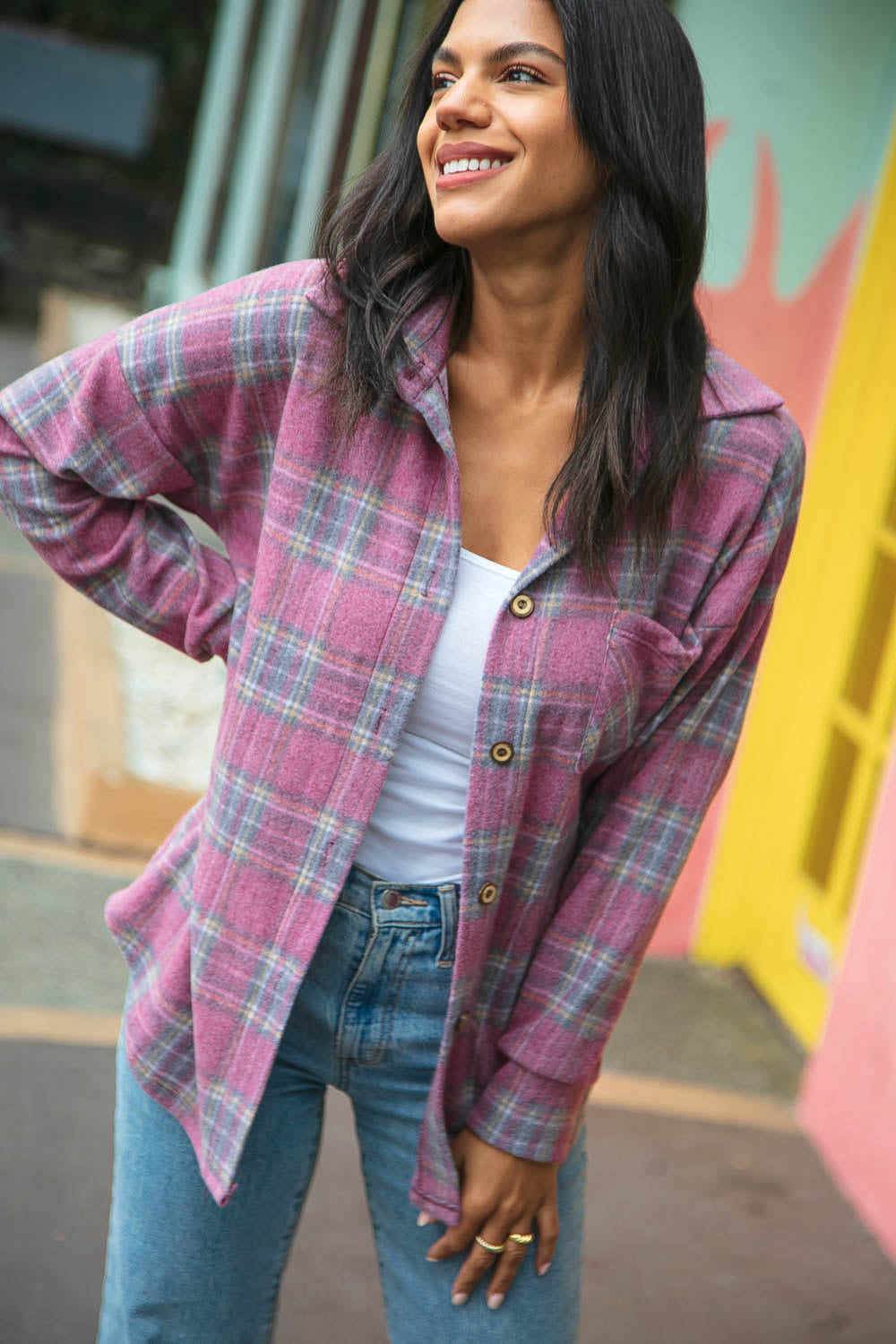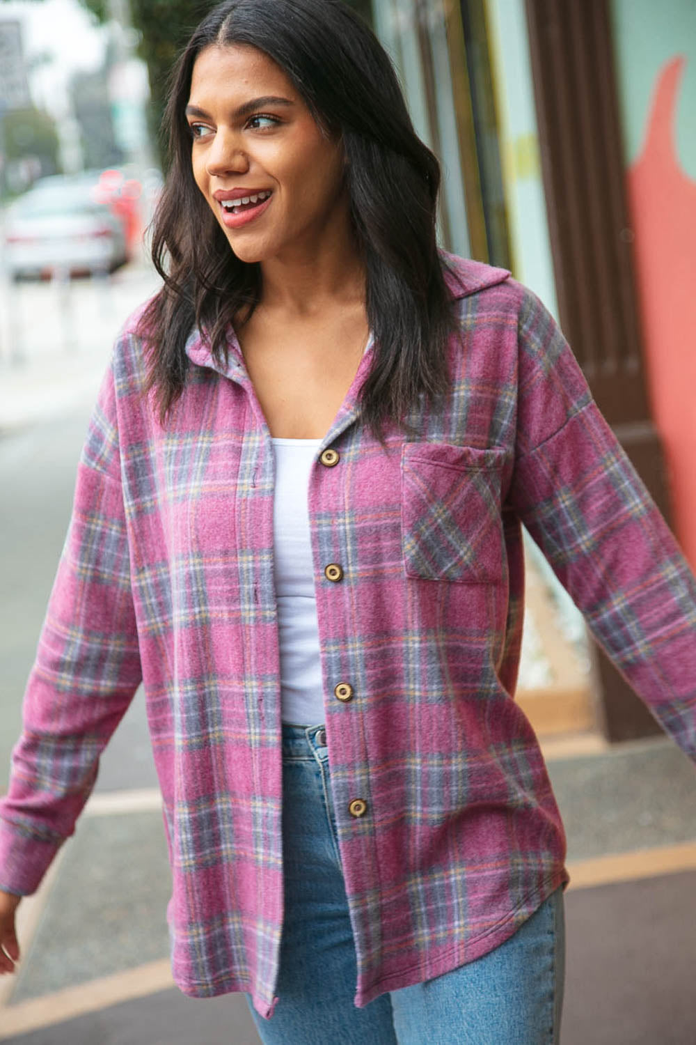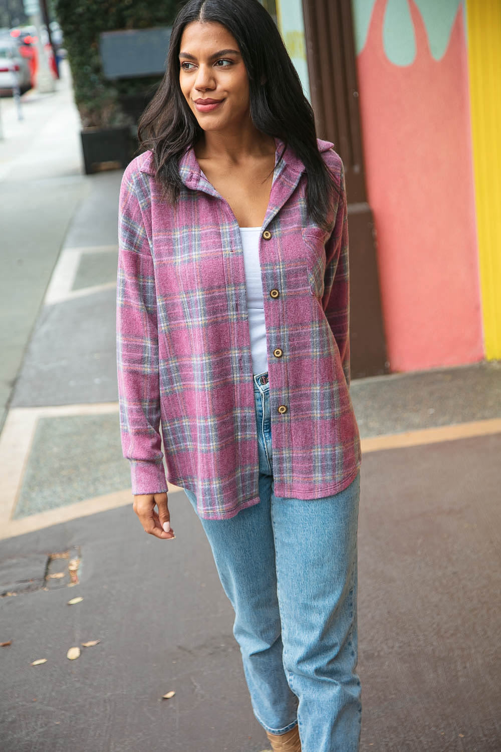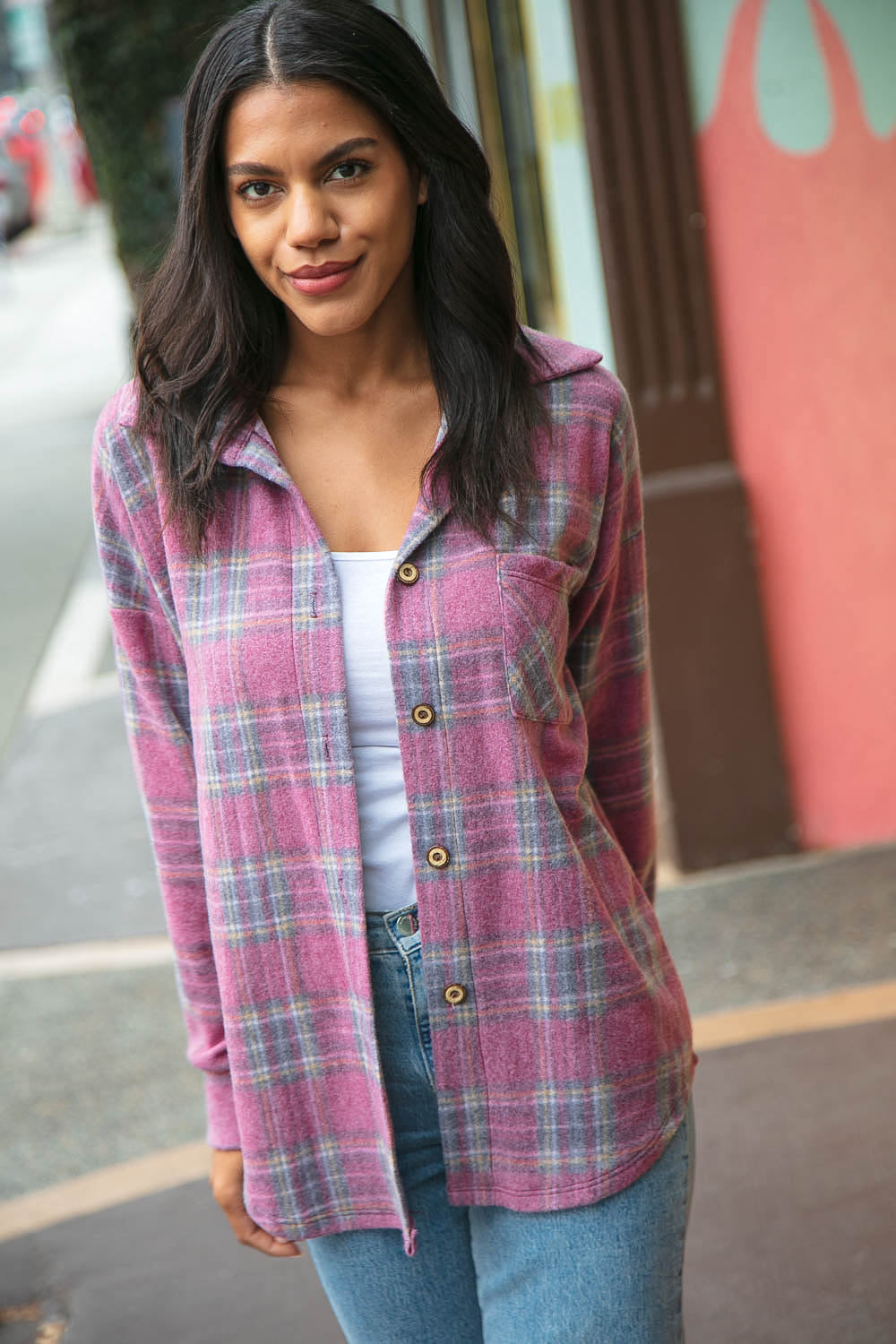 Dark Rose Brushed Hacci Plaid Button Down Jacket (dropship)